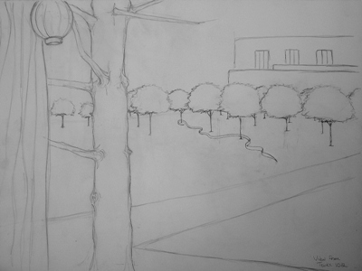 Update: I just recently found this conceptual drawing in one of my portfolios, evidently one that I did in the planning stages of this project, so you can at least see the general design even if I have no picture of the actual construction. The snake-like thing winding through the trees is what I actually built, and this is what it would've looked like as seen from the window of my freshman year dorm room. Not For Sale